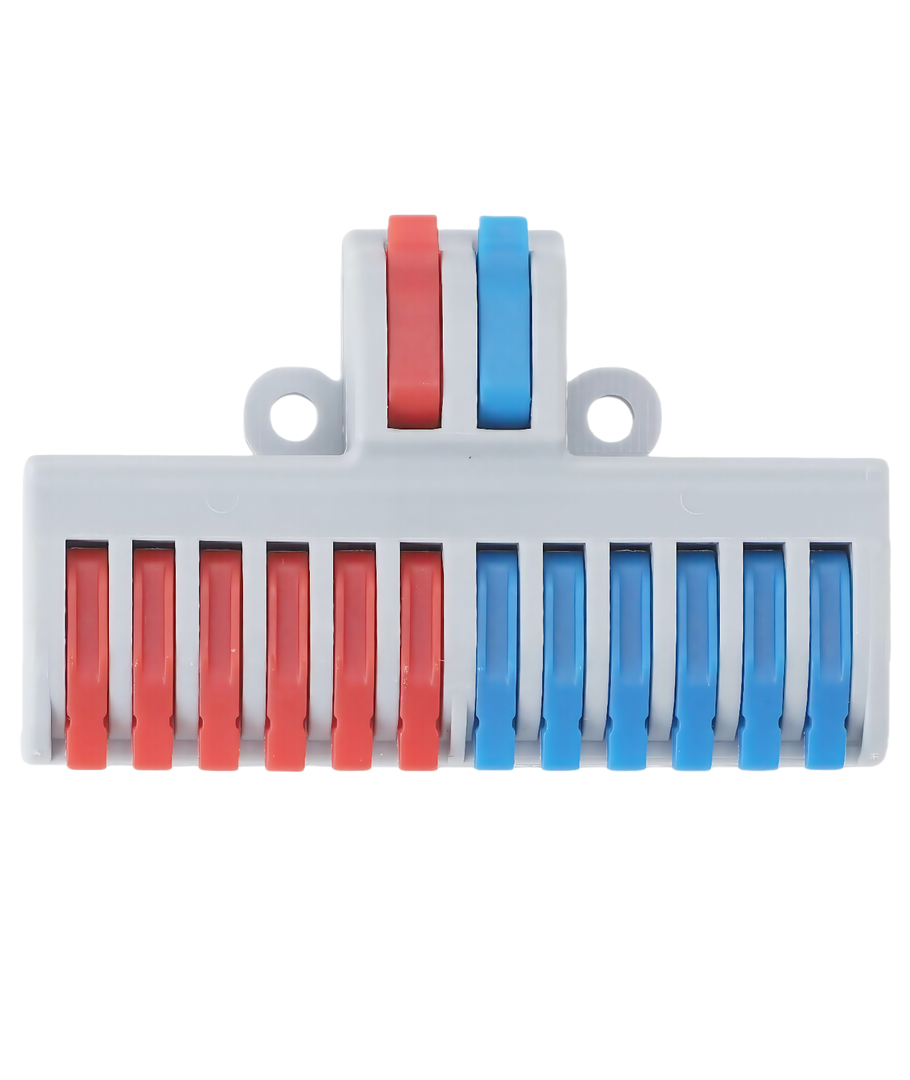 De har et praktisk tilslutningssystem, med orange/blå vippepal, som gør det nemt at få de bløde ledere ind i hullerne.