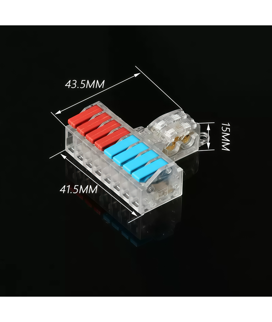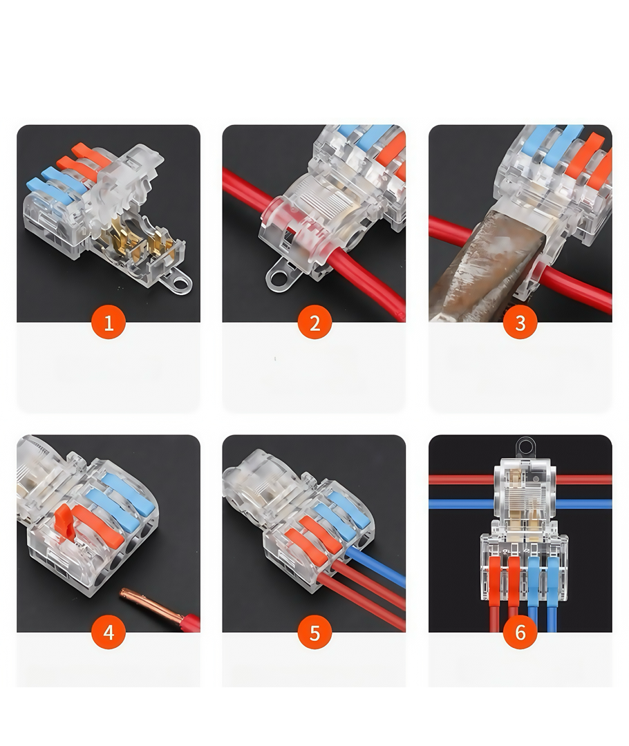 De har et praktisk tilslutningssystem, med orange/blå vippepal, som gør det nemt at få de bløde ledere ind i hullerne.