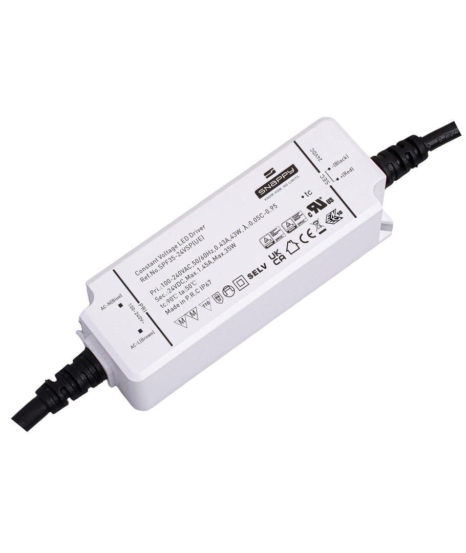 Optimal til dine behov for LED belysning, leverer denne 35W strømforsyning fra Snappy stabil og sikker strøm til dit lysudstyr. Den er designet til at blive tilsluttet en 230V forsyning og konverterer dette til 24V DC med en strømstyrke på 1,45A.