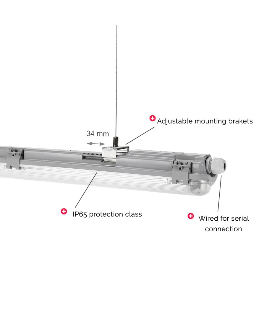 Denne innovative belysningsløsning leveres med et 24W T8 LED rør, der er 150 cm langt, og som tilsvarer et traditionelt 48W lysstofrør på 161 cm. Det tilsluttes nemt til en 230V forsyning.