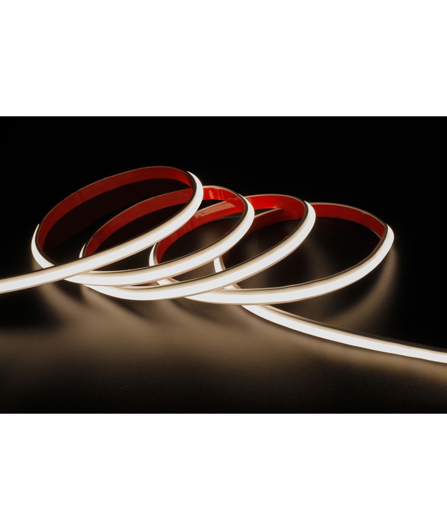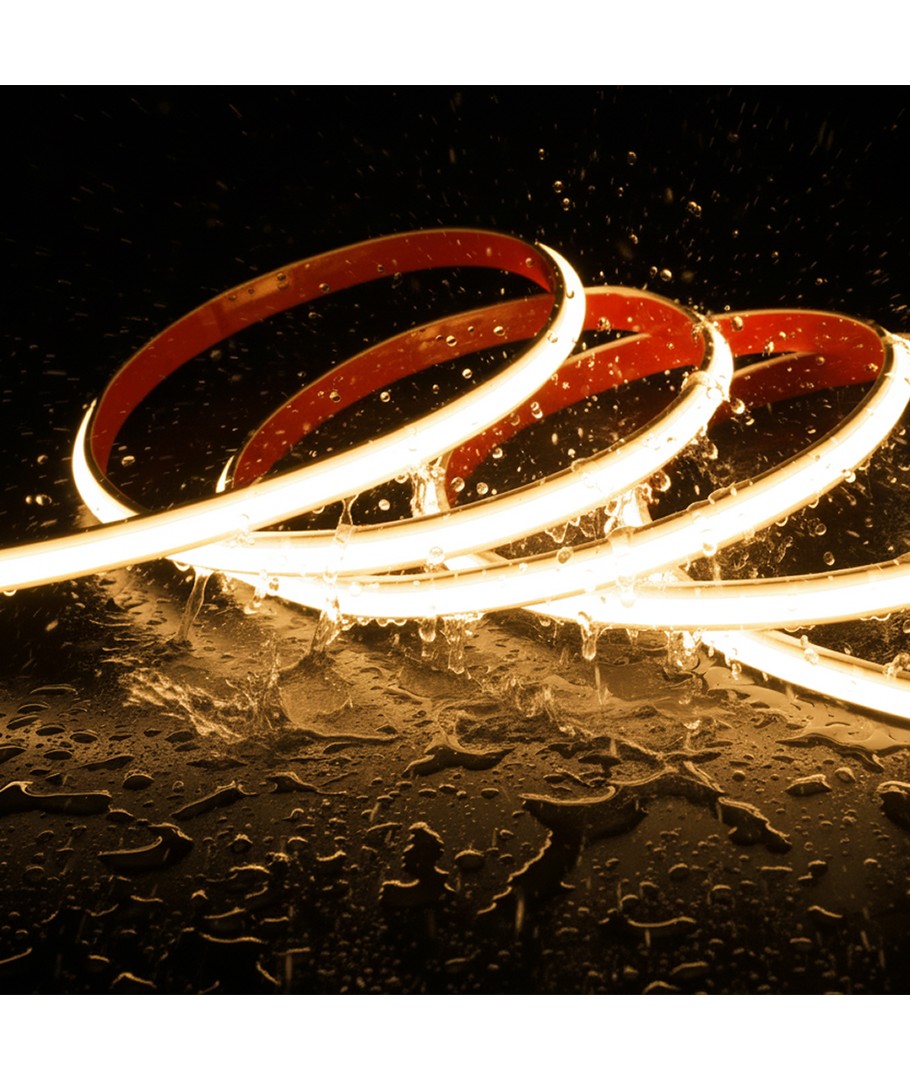 Denne vandtætte slim COB LED strip på 230V leverer et kraftigt, ensartet lys helt uden synlige dioder. Det betyder, at du får et elegant lysbånd uden huller i lyset – og fordi strippen kører direkte på 230V, er der ingen behov for transformator. Monteringen er enkel med den for-monterede tape på bagsiden, og du kan bestille den i op til 50 meter i ét samlet stykke.
