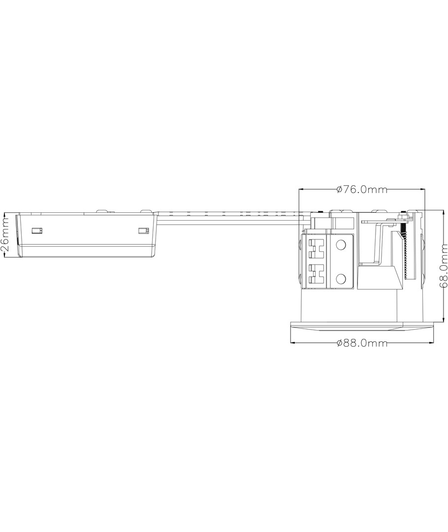 Denne indbygningsspot har dimensioner på 68 x Ø88 mm med en hul størrelse på 76 mm, hvilket sikrer en sikker og korrekt pasform i de fleste standard installationshuller.