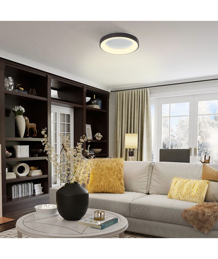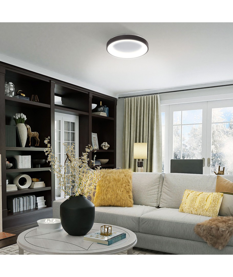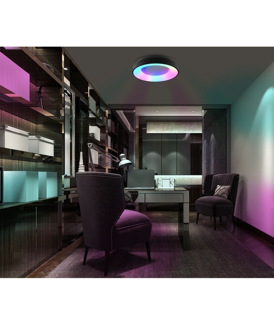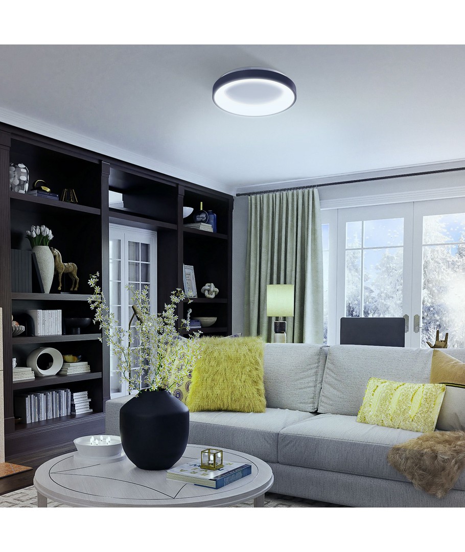 Designet er enkelt og stilfuldt i en sort finish, der passer ind i moderne interiører. Med en størrelse på 450 x 450 x 80 mm passer den perfekt i de fleste rum uden at dominere. Bemærk, at lampe har en IP20 klassificering, der betyder, at den ikke er modstandsdygtig over for vand.