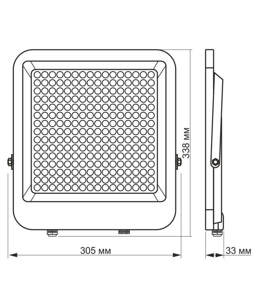 Denne projektør har IP65 klassifikation, hvilket gør den egnet til udendørs brug. Den er beskyttet mod vandstænk og regn, hvilket sikrer pålidelig ydeevne i alle vejrforhold. Dimensionerne på 305 x 338 x 33 mm gør det let at integrere i forskellige opsætninger.